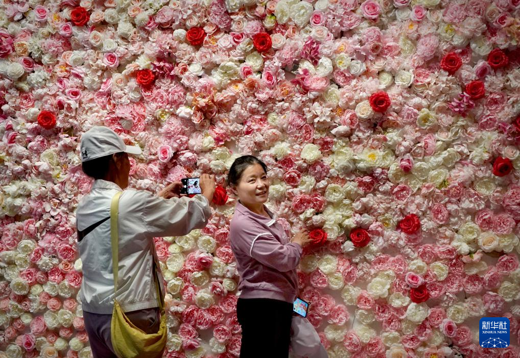 4月16日,游客在洛阳牡丹阁“牡丹花墙”前拍照留念。新华社记者 李安 摄