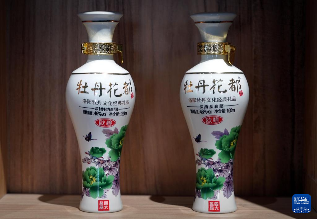 4月16日,在洛阳牡丹阁拍摄的带有牡丹元素的酒产品。新华社记者 李安 摄
