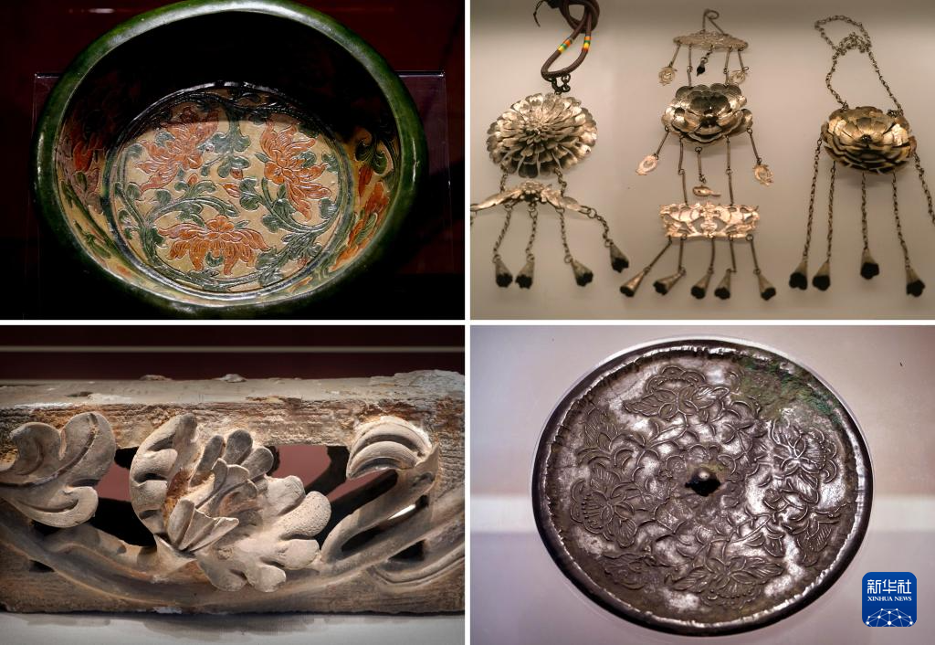 拼版照片:4月16日在洛阳牡丹阁拍摄的三彩牡丹纹大盆(左上)、牡丹银饰(右上)、房脊砖雕(左下)、牡丹纹铜镜(右下)。新华社记者 李安 摄