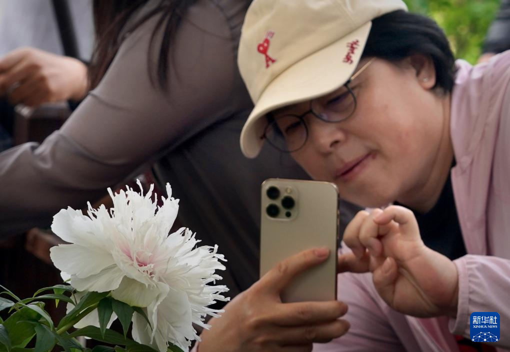 4月17日,游客在河南省洛阳市隋唐城遗址植物园拍摄牡丹晚开品种“银丝贯顶”。新华社记者 李安 摄
