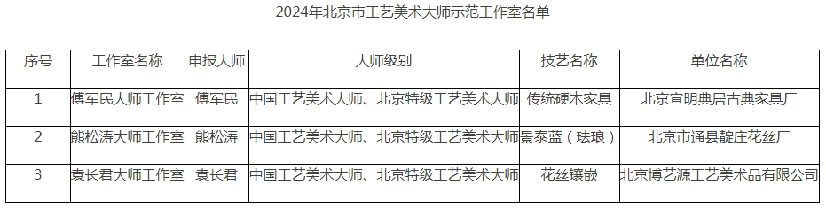 为深入贯彻落实《北京市传统工艺美术保护办法》,进一步弘扬工匠精神,加强北京市工艺美术大师工作室建设,按照《北京市传统工艺美术保护发展资金管理暂行办法》《北京市工艺美术大师示范工作室管理暂行办法》等有关要求,北京市经济和信息化局组织开展了北京市工艺美术大师示范工作室的组织申报和评审等工作,现将2024年北京市工艺美术大师示范工作室名单予以公布。