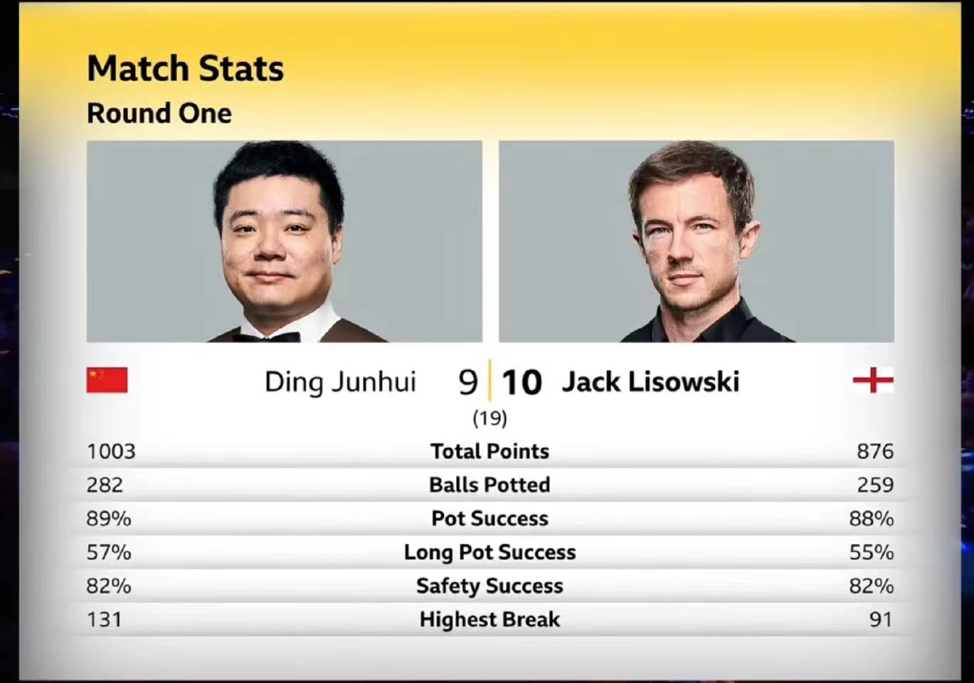 丁俊晖首轮对手是英格兰球手利索夫斯基,在19局10胜制比赛中,他一度7比9落后。但丁俊晖凭借单杆56分、131分成功将大比分扳为9平。决胜局,利索夫斯基率先上手得分,中间一次进攻失误给了丁俊晖机会,但后者过于保守与机会失之交臂,利索夫斯基随后继续上手连续得分赢下比赛,丁俊晖遗憾止步首轮。张安达、吕昊天、庞俊旭此前也已遭淘汰。