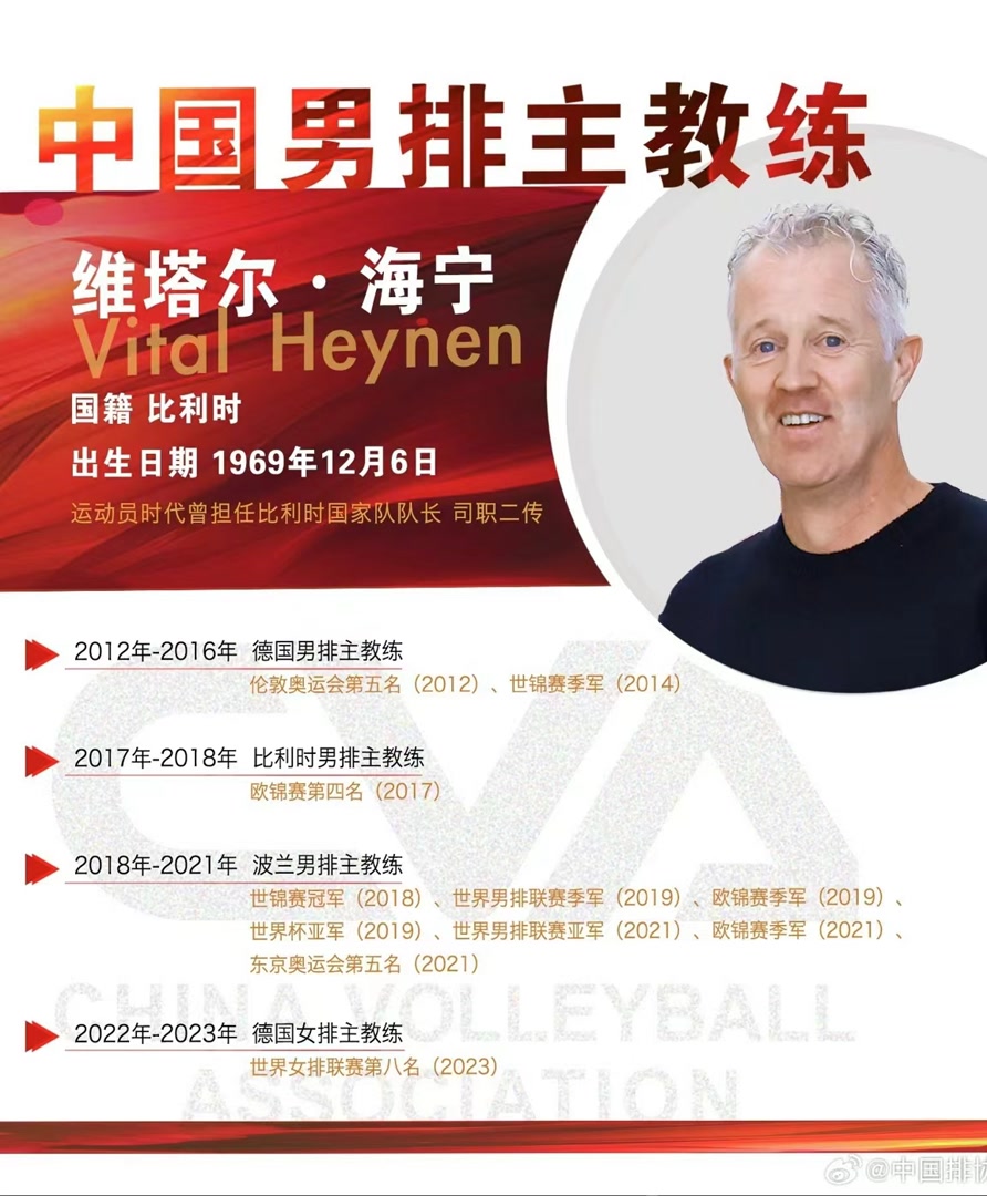 4月25日,根据中国排协消息,为提高中国男子排球国家队竞技水平,做好新周期训练备战工作,经专家组评议,中国排球协会决定聘任比利时籍教练维塔尔·海宁为中国男排主教练。