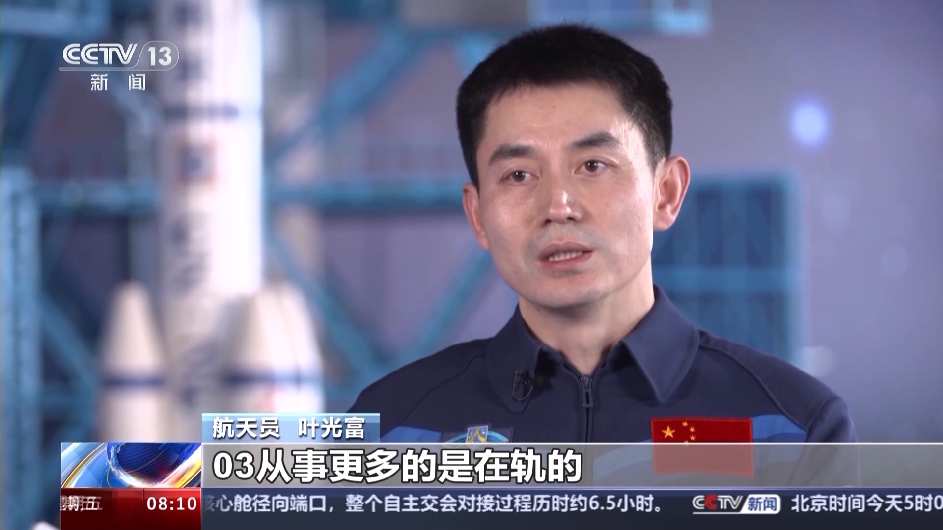 航天员叶光富:相对于上次来说,03从事更多的是在轨的日常维护、照料、管理,同时也进行很多试实验。而这一次确实是以指令长的身份带领两位新同志执行任务,实际上还是有很多考验、压力的。因为指令长你的职责是对整个任务要负责。