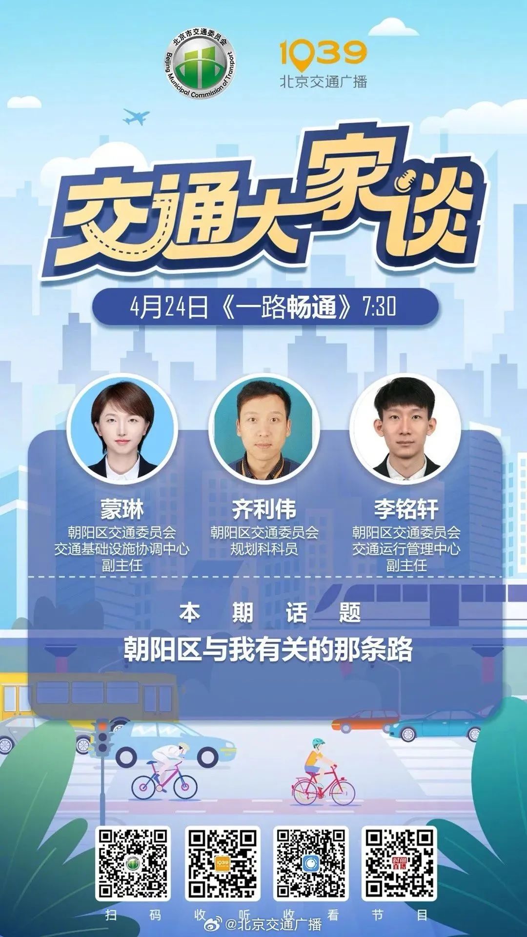 “交通大家谈”第355期节目,我们邀请到朝阳区交通委交通基础设施协调中心副主任蒙琳、朝阳区交通运行管理中心副主任李铭轩、朝阳区交通委规划科科员齐利伟做客直播间,来和大家一起聊聊今年朝阳区交通综合治理行动都有哪些“干货”?