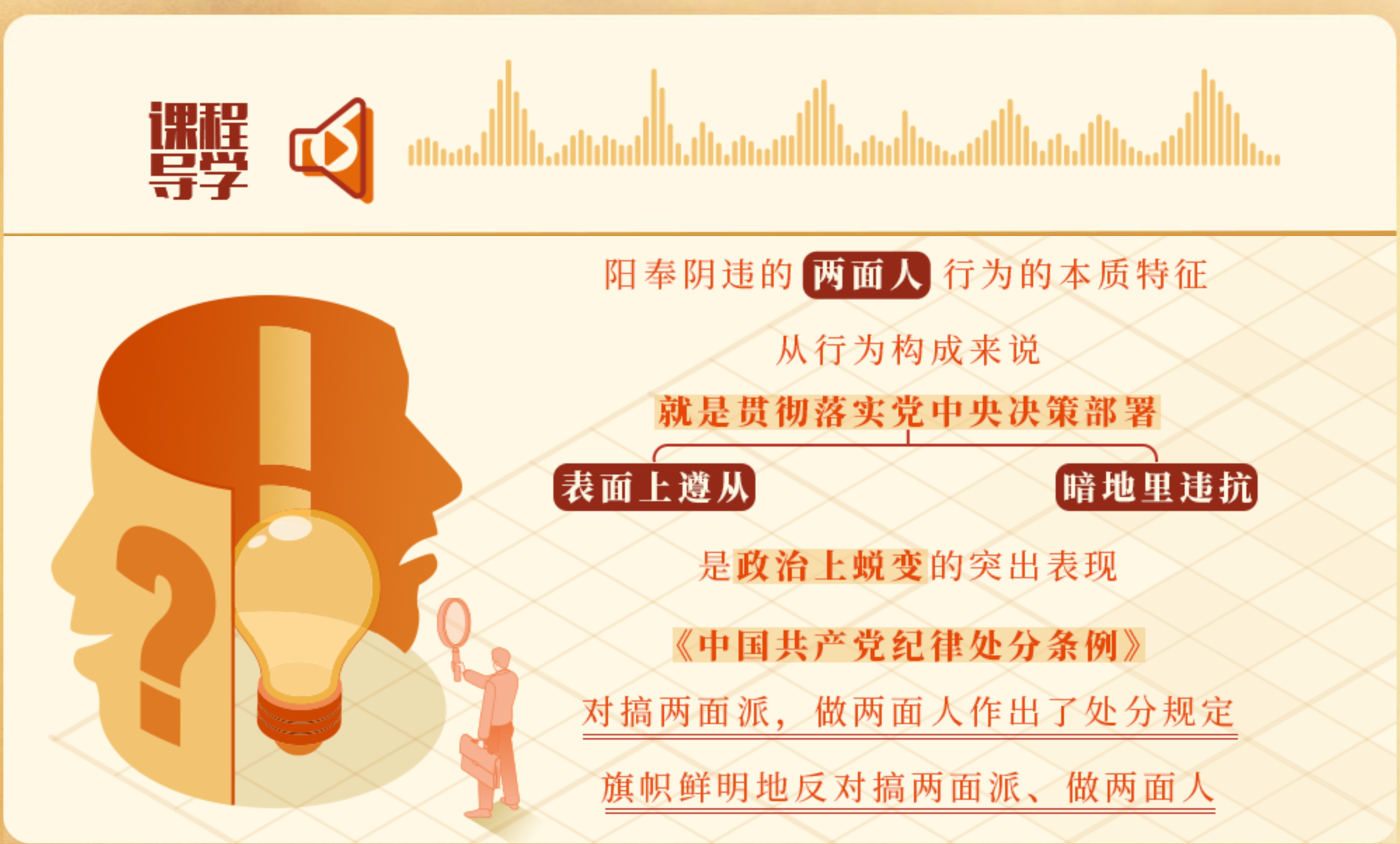 阳奉阴违的两面人行为的本质特征,从行为构成来说,就是贯彻落实党中央决策部署表面上遵从,暗地里违抗,是政治上蜕变的突出表现。