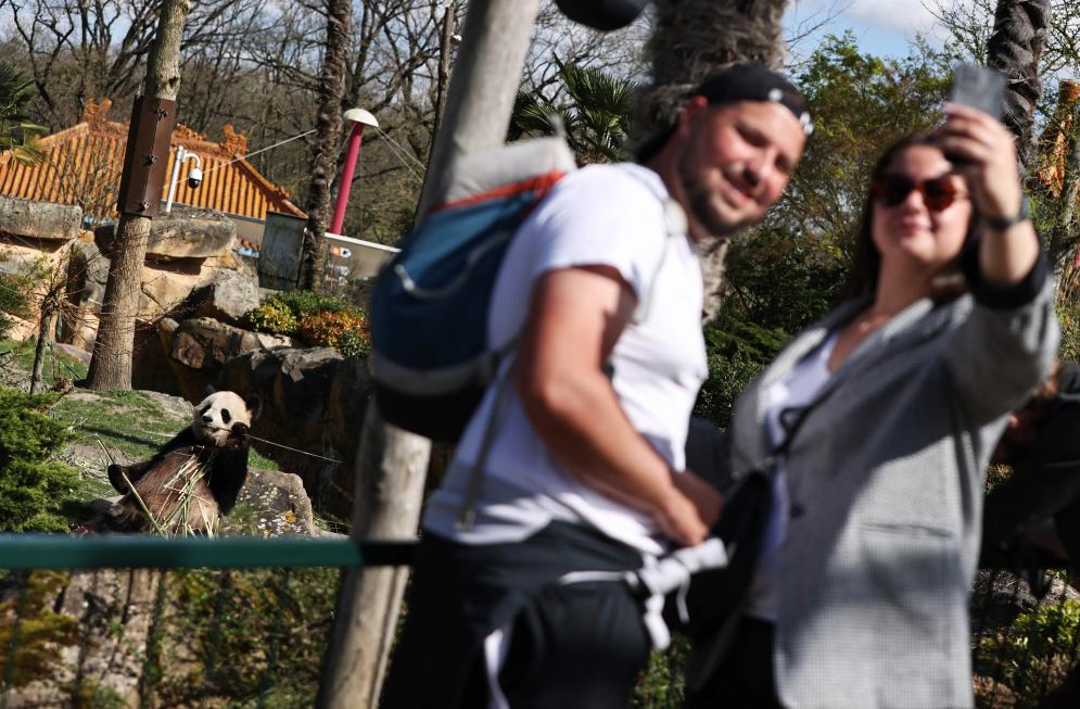 3月22日,在法国圣艾尼昂的博瓦勒野生动物园,游客与大熊猫“欢欢”自拍留念。新华社记者高静摄