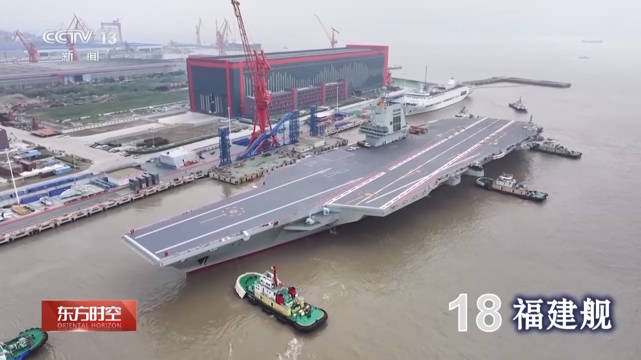 2022年6月17日,我国第三艘航空母舰下水。经中央军委批准,命名为“中国人民解放军海军福建舰”,舷号为18。福建舰是我国完全自主设计建造的首艘弹射型航空母舰。