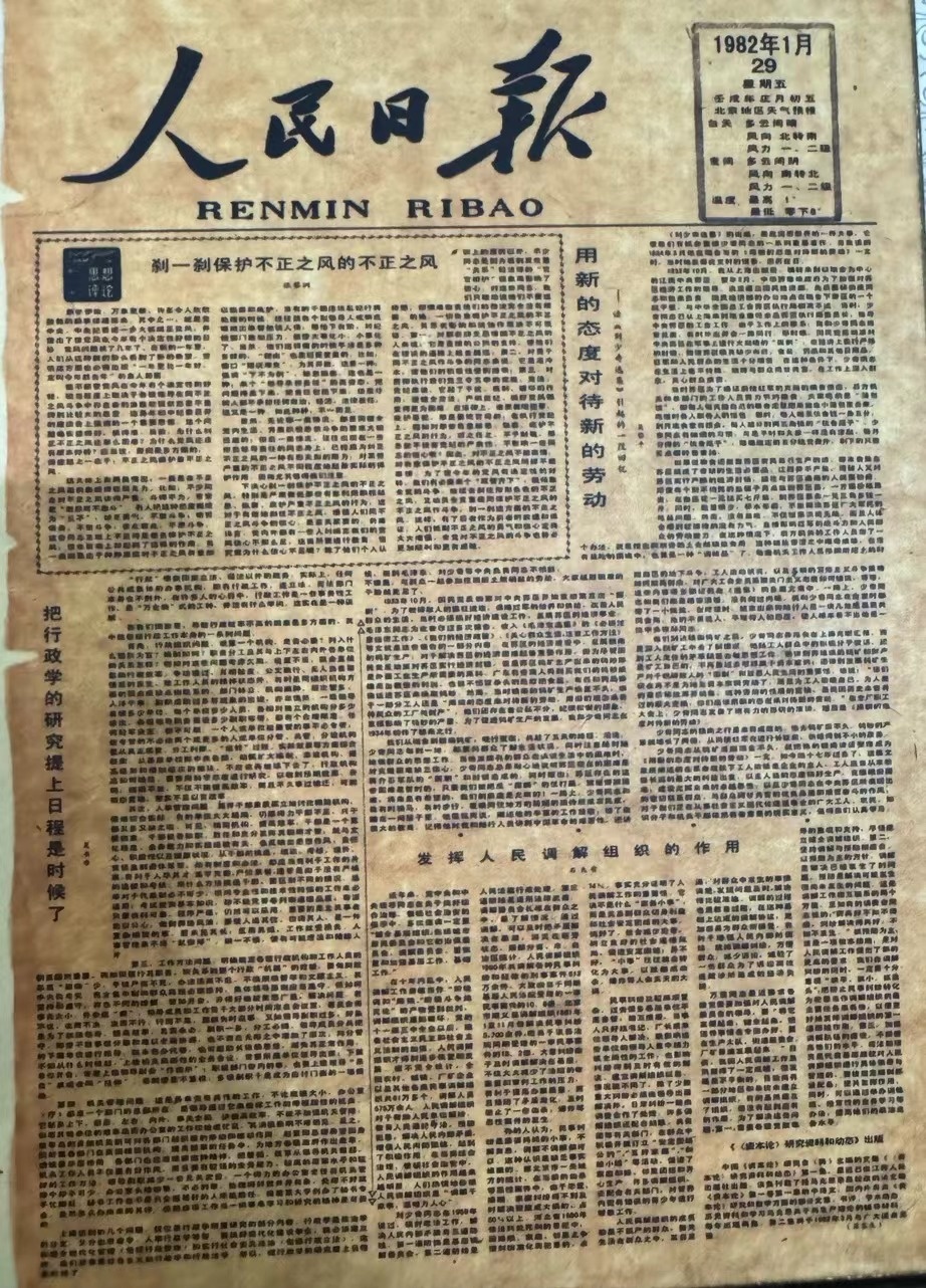 在夏老家的客厅,书架的醒目位置摆着一份报纸的影印照片,那是1982年1月29日,夏书章在《人民日报》头版发表的文章《把行政学的研究提上日程是时候了》,这是学界公认的有关共和国行政学建设的第一声呼吁。