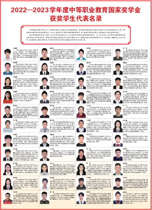 经过严格选拔和评审,全国约2万名中职学生荣获2022—2023学年度中等职业教育国家奖学金。以下100名学生,是中等职业教育国家奖学金获奖学生中的优秀代表。希望全国中等职业学校学生以他们为榜样,把个人理想追求融入党和国家事业之中,志存高远、脚踏实地,以匠心筑梦,以技能修身,练就过硬本领,不负时代使命,努力将自己锻造成为新时代的大国工匠。