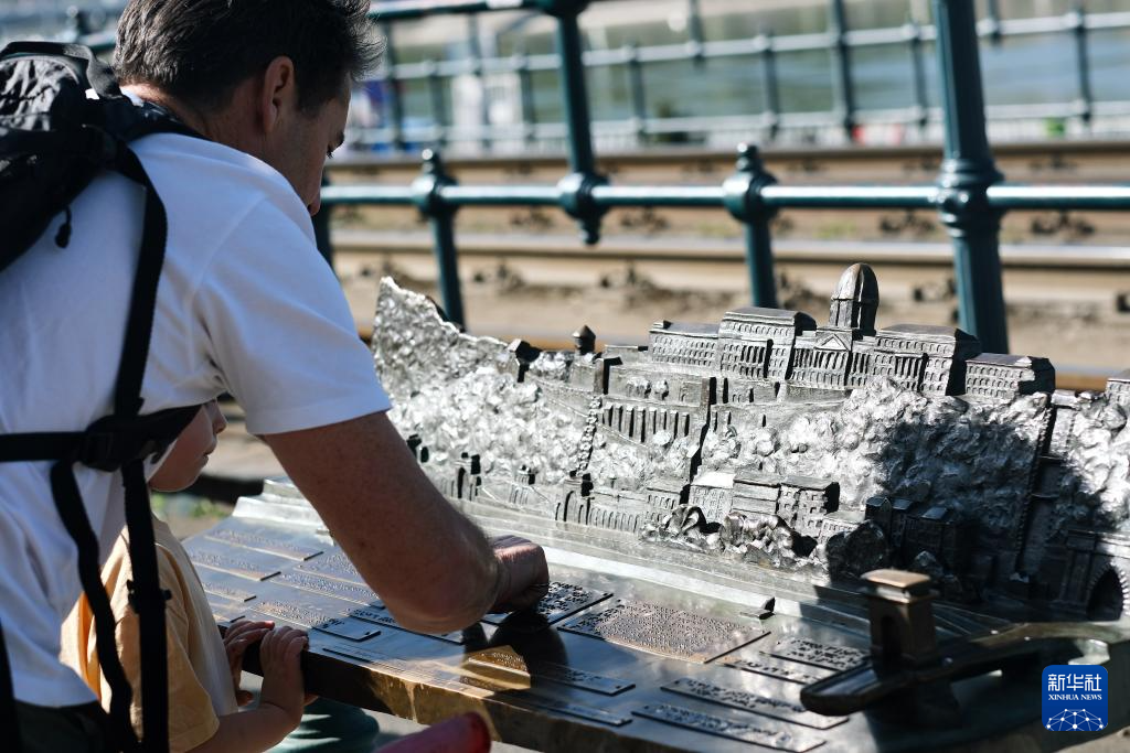 在匈牙利布达佩斯,一名父亲带着孩子观看城市模型(2024年4月13日摄)。新华社记者 郑开君 摄