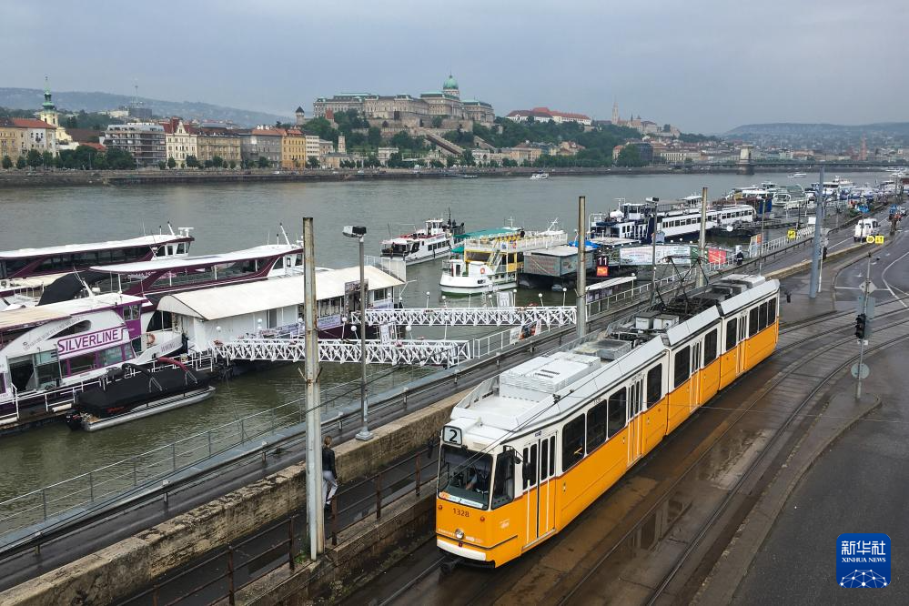 一辆电车驶过匈牙利布达佩斯多瑙河边的游船码头(2021年5月19日摄)。新华社记者 郑焕松 摄