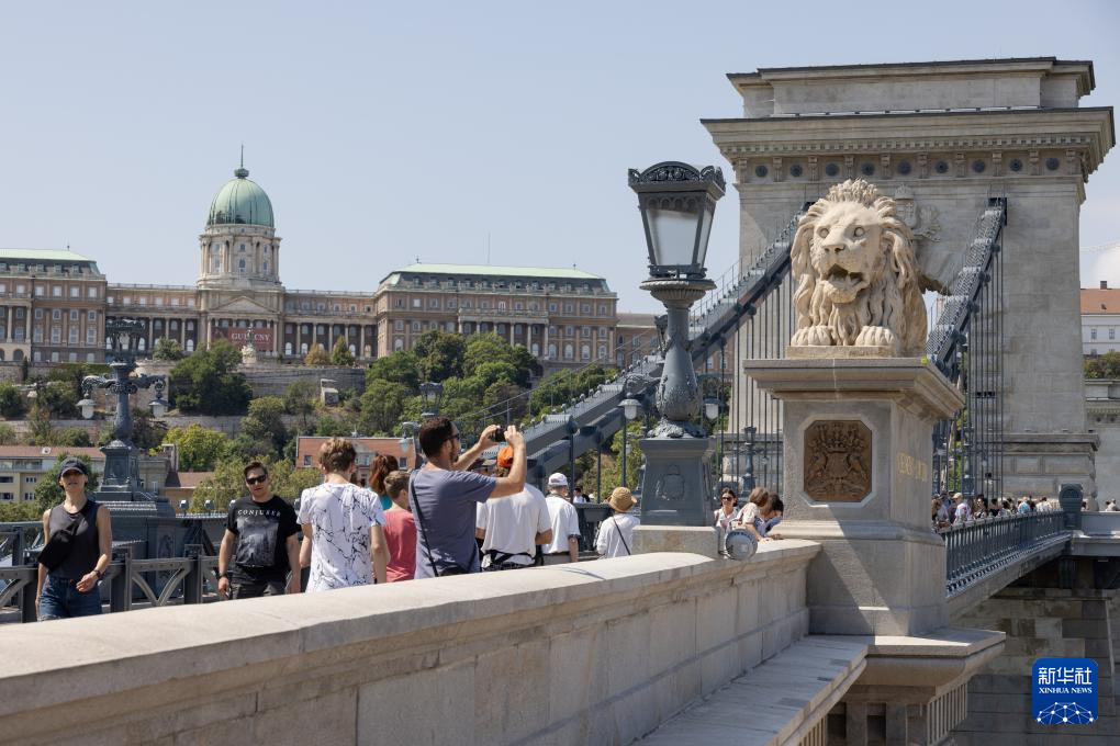 在匈牙利布达佩斯,人们走在链子桥上(2023年8月4日摄)。新华社发(弗尔季·奥蒂洛摄)