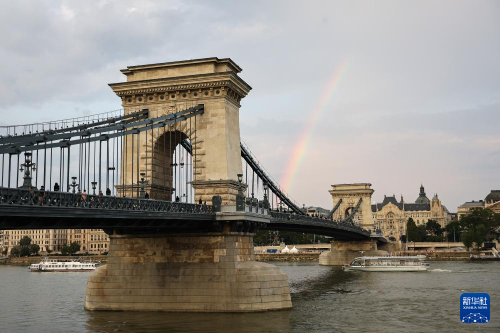 彩虹挂在匈牙利布达佩斯链子桥后的天空(2023年8月17日摄)。新华社记者 郑焕松 摄