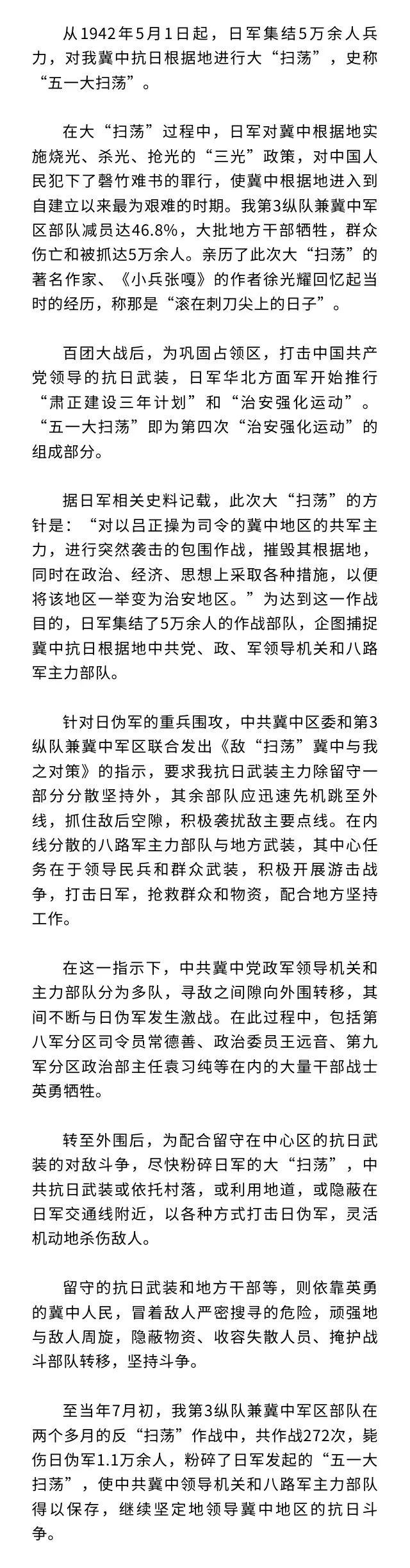 日军5万余对冀中抗日根据地进行大“扫荡”,即称“五一大扫荡”。实行烧光、杀光、抢光的“三光”政策。