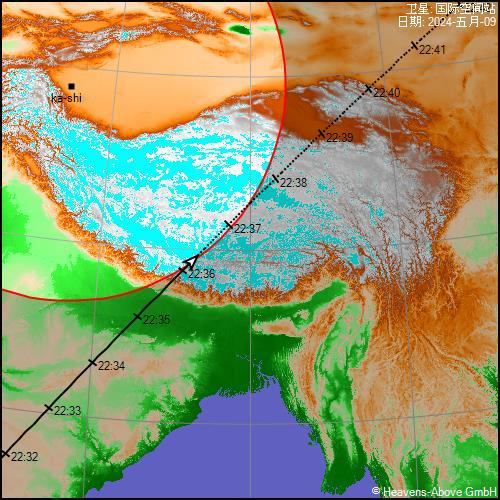 5月9日预报的星下点轨迹图,理论上高亮的圆形区都可以观赏到国际空间站。图/天文专家微博