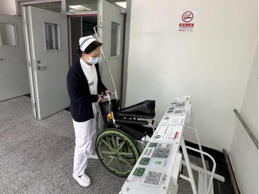 同期,门诊办公室护士长更新了操作提示版面,用以指导患者独立操作租借系统。考虑到部分老年人存在使用手机不方便的情况,门诊办公室与患者服务中心联合协作,在咨询台放置了轮椅,以便不能扫码租借的患者使用轮椅,方便就诊人群的不同需求。