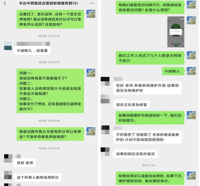 专班综合分析,医院就诊人群中老年人群占比日渐增长,对于自助设备、互联设施的使用存在不适应、不会用等情况,如果再叠加门诊引导服务、文字指引提示不充分等因素,难免会出现退押金不及时或不顺畅的情况,造成就诊患者的误解或质疑。在了解到其他医院有不需要押金的共享轮椅后,门诊办公室主任和护士长前往取经,再次和共享轮椅服务提供方联系,希望能够实现就诊人员免押金租用共享轮椅。在多次沟通交流之后,维护方同意更换减免押金操作系统,共享轮椅新系统进入安装调试阶段,新上线的轮椅系统可以实现信用免押,就诊患者及其家属通过微信扫一扫就可以免押金使用共享轮椅。门诊办公室工作人员对其进行扫码测试,并就测试之中发现的问题一一和厂家进行了反馈工作,特别就老年人使用问题进行了多条反馈。在经过再一次系统调试后,新的共享轮椅在接到诉求件9天后正式开始上线为患者服务。