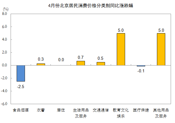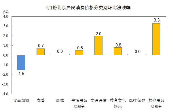 4月份,北京居民消费价格同比上涨0.2%。其中,食品价格下降4.0%,非食品价格上涨1.0%;消费品价格下降0.6%,服务价格上涨1.2%。