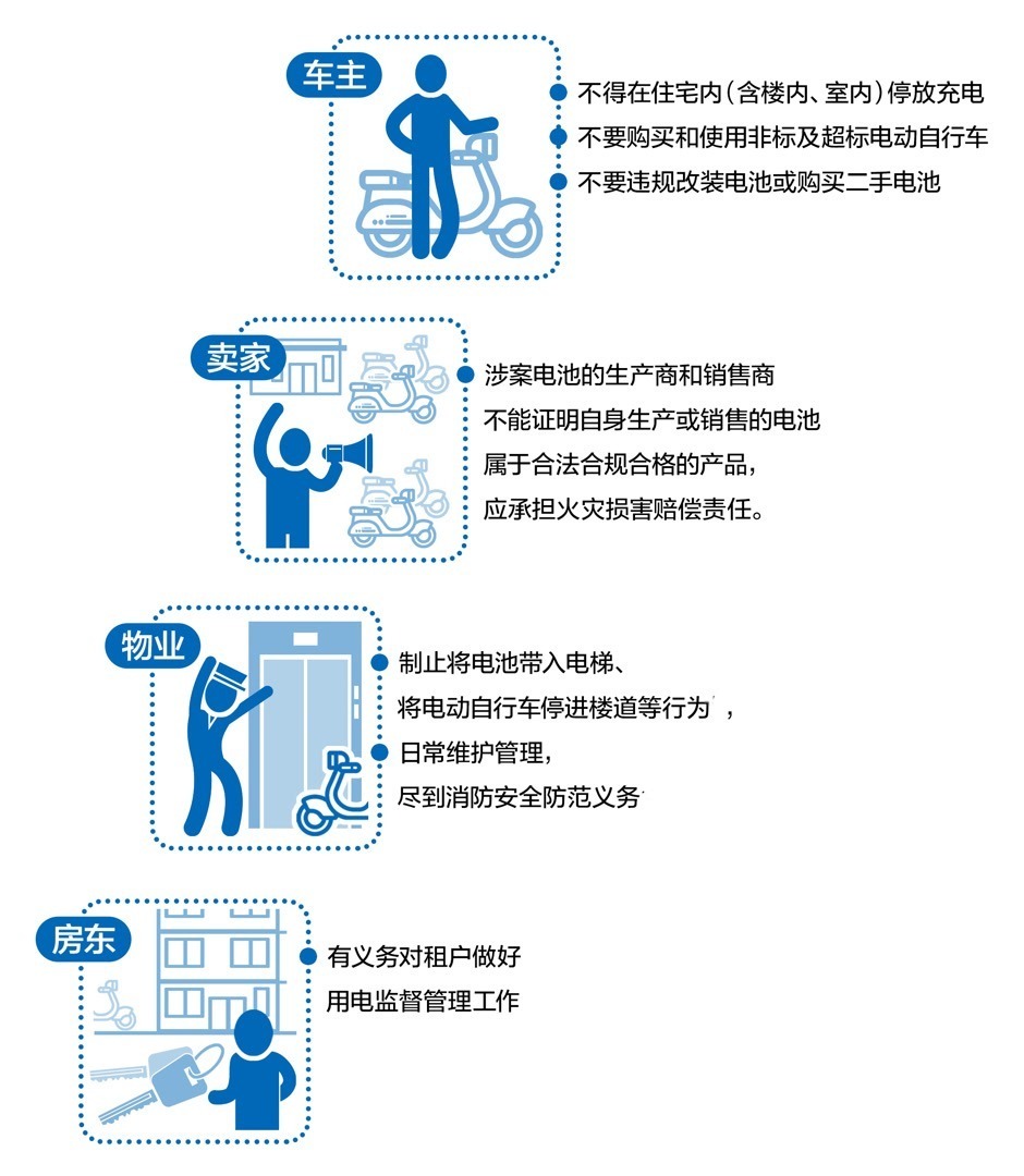 划重点:电动自行车所有者、使用者应将电动自行车或电池放置在集中充电设施中,切勿在住宅内(含楼内、室内)停放充电;切勿将车停放在建筑内的走廊、楼梯间、疏散通道及安全出口,严禁在上述公共区域停放或充电;不要购买和使用非标及超标电动自行车;不要违规改装电池或购买二手电池。即使将车停放在公共充电棚,也应对安全情况尽到注意义务,及时发现并排除车辆故障及安全隐患。