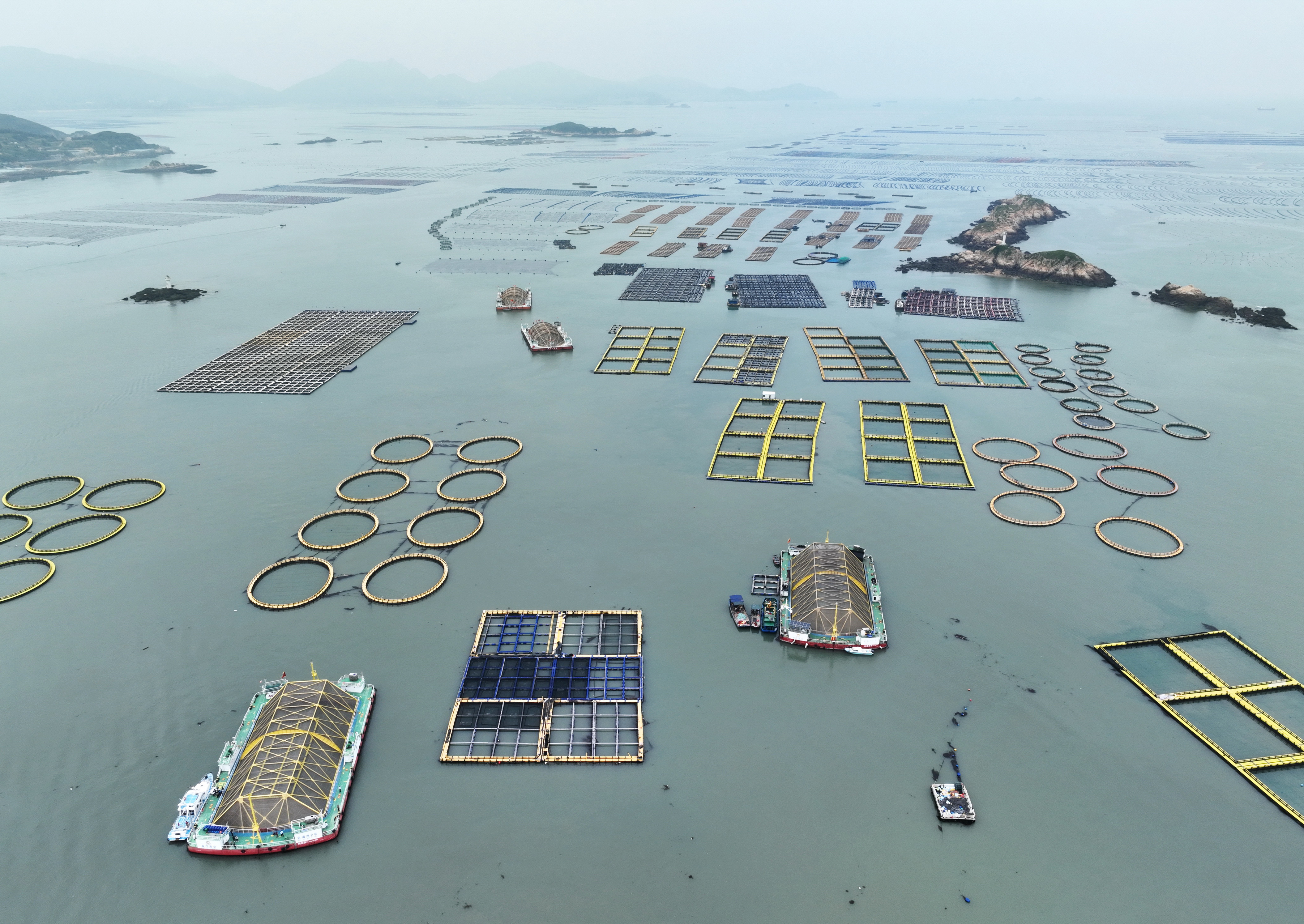 在福建连江定海湾海域,坐落着“闽投1号”“乾动1号”“定海湾1号”等深远海养殖平台。从高空俯瞰,一座座篮球场大小的钢构平台卧于海上,大黄鱼等养殖品在深海“畅游居住”。