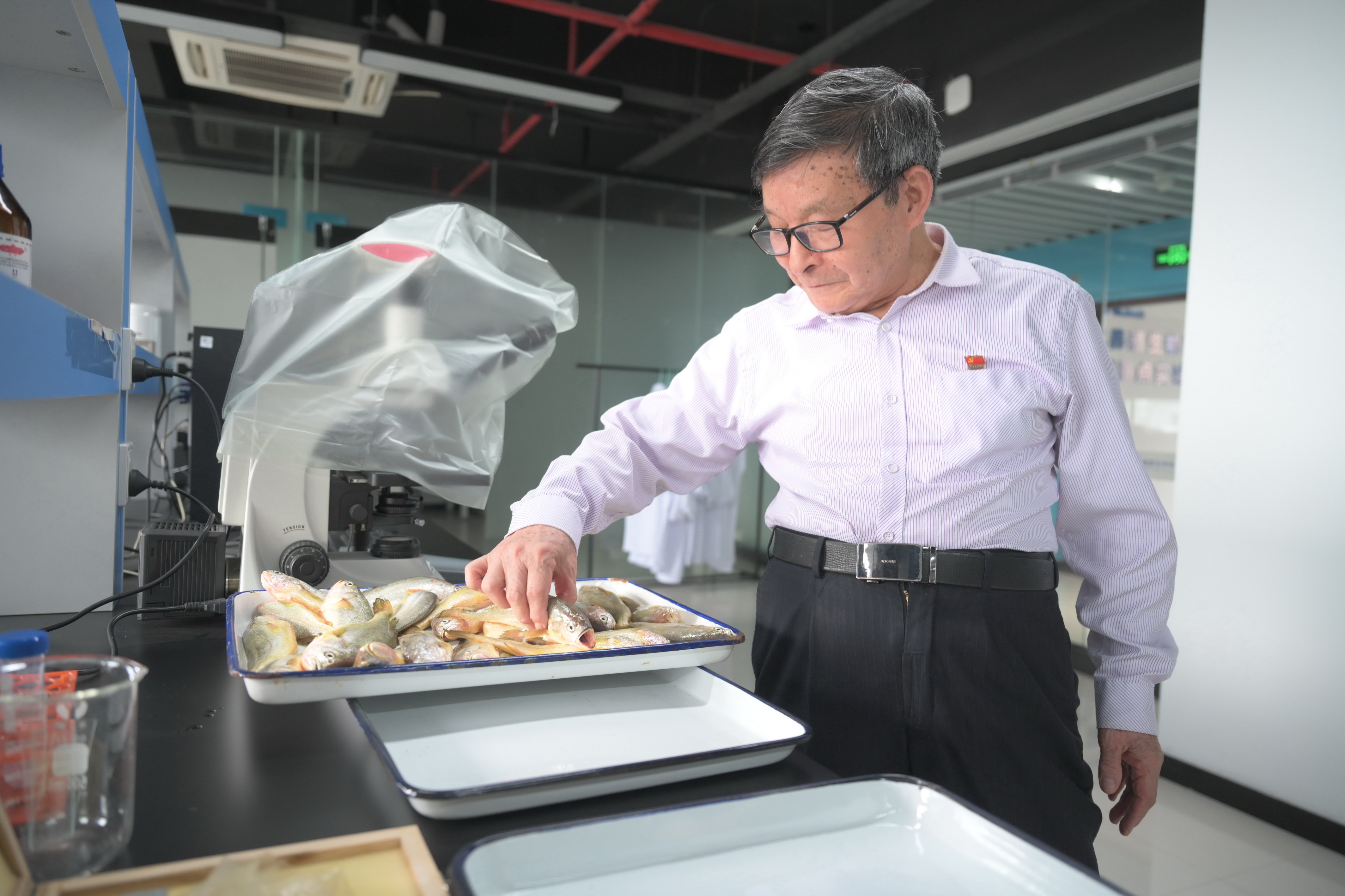 2024年5月8日,刘家富在位于福建省宁德市科技服务中心大楼的海水养殖生物育种全国重点实验室了解大黄鱼的培育情况。新华社记者 林善传 摄