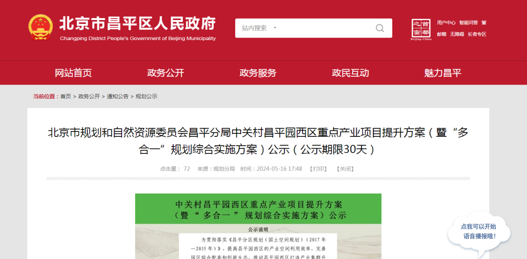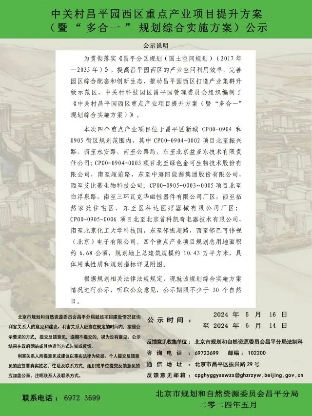 5月16日,北京市昌平区人民政府官网发布了中关村昌平园西区重点产业项目提升方案(暨“多合一”规划综合实施方案)公示(公示期限30天)。