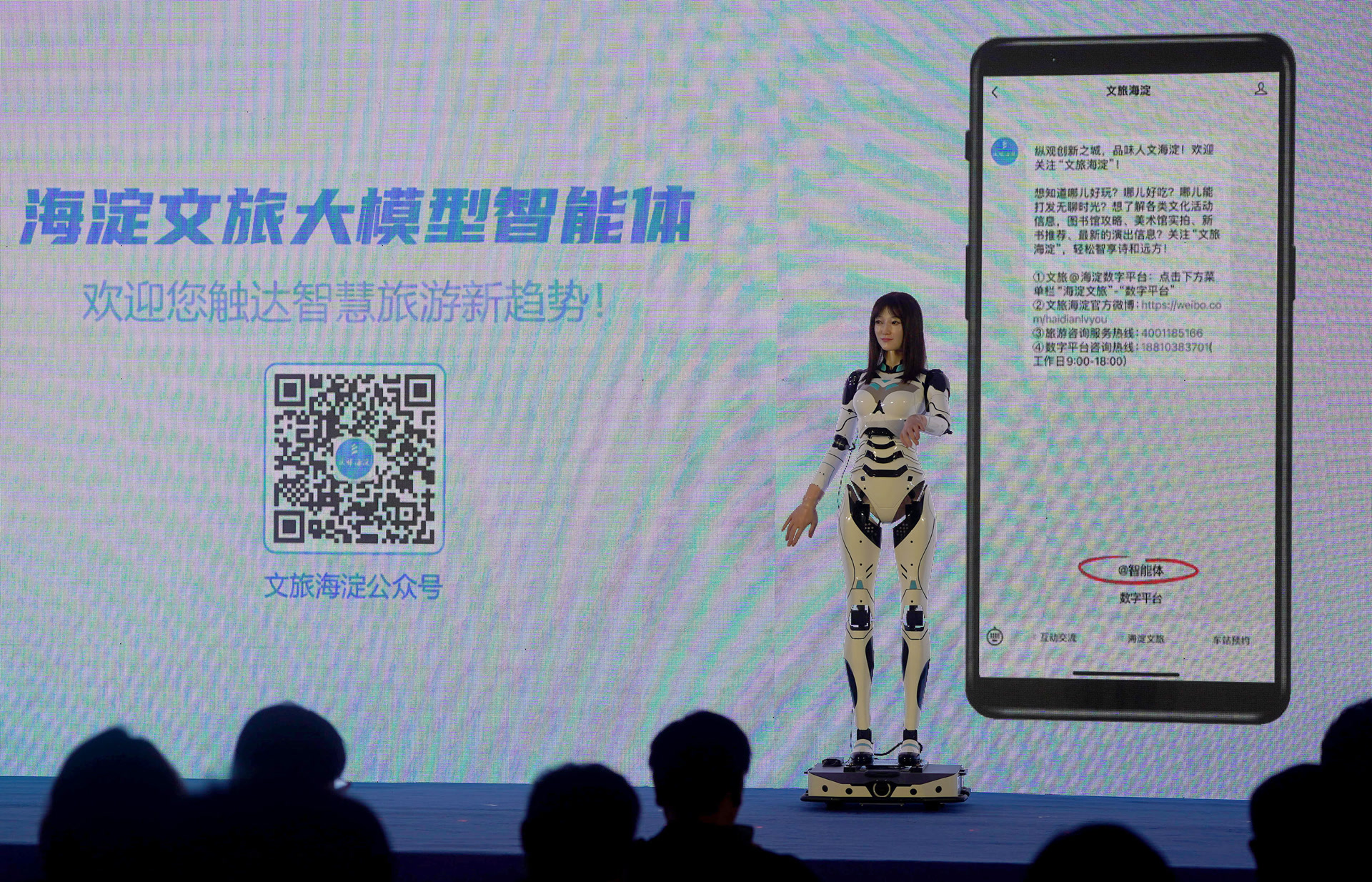 活动现场,海淀区文旅局副局长王森邀请智能机器人“小如”登场,这位搭载了海淀文旅业大模型的“美女”,自带科技感,登台互动交流,一点儿不怯场。