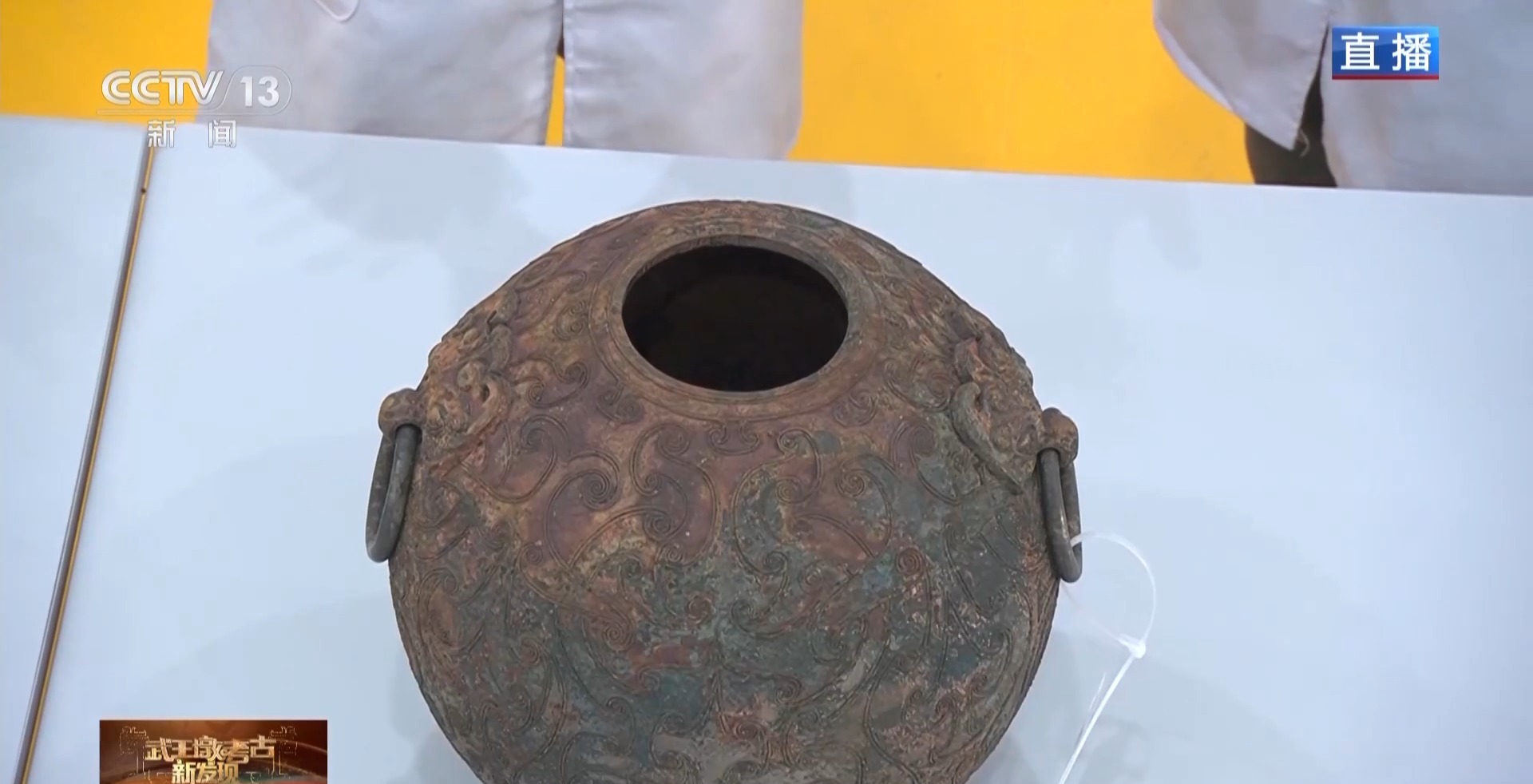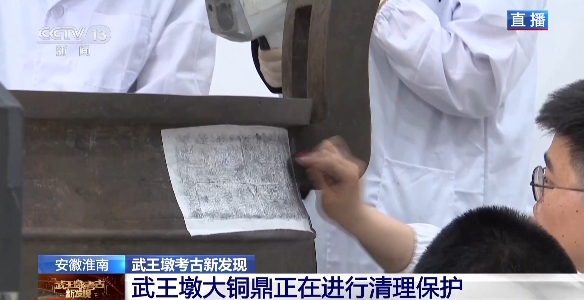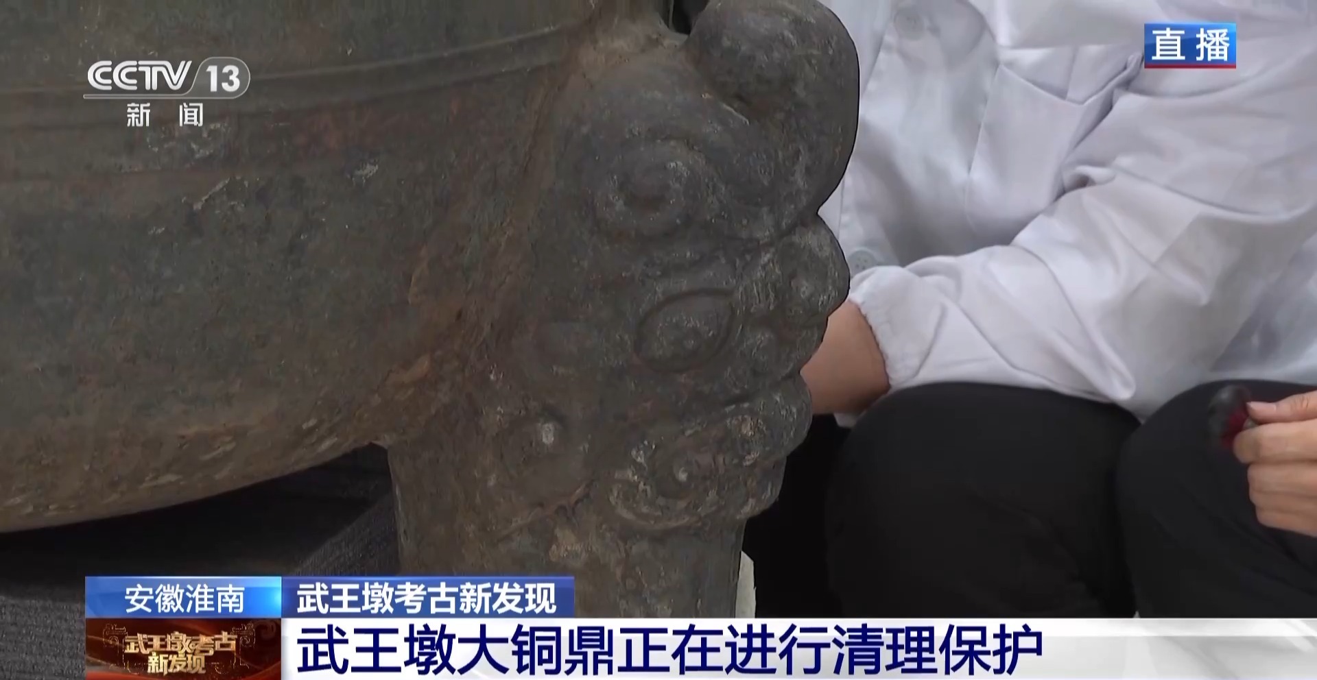在武王墩考古发掘现场的实验室,大铜鼎经过一天的清理和应急保护之后,第一次完完全全毫无遮挡地展现在我们面前,非常震撼。我们请到了实验室的张治国老师来带我们看看这件青铜重器上的秘密。