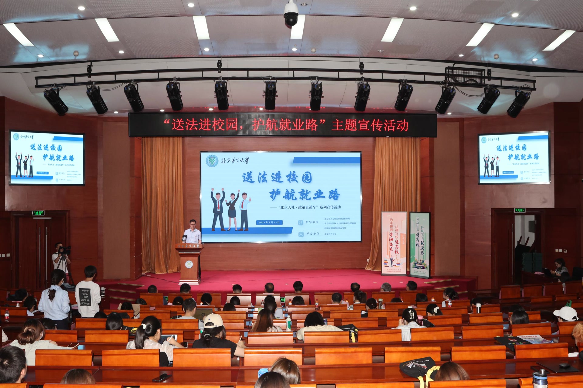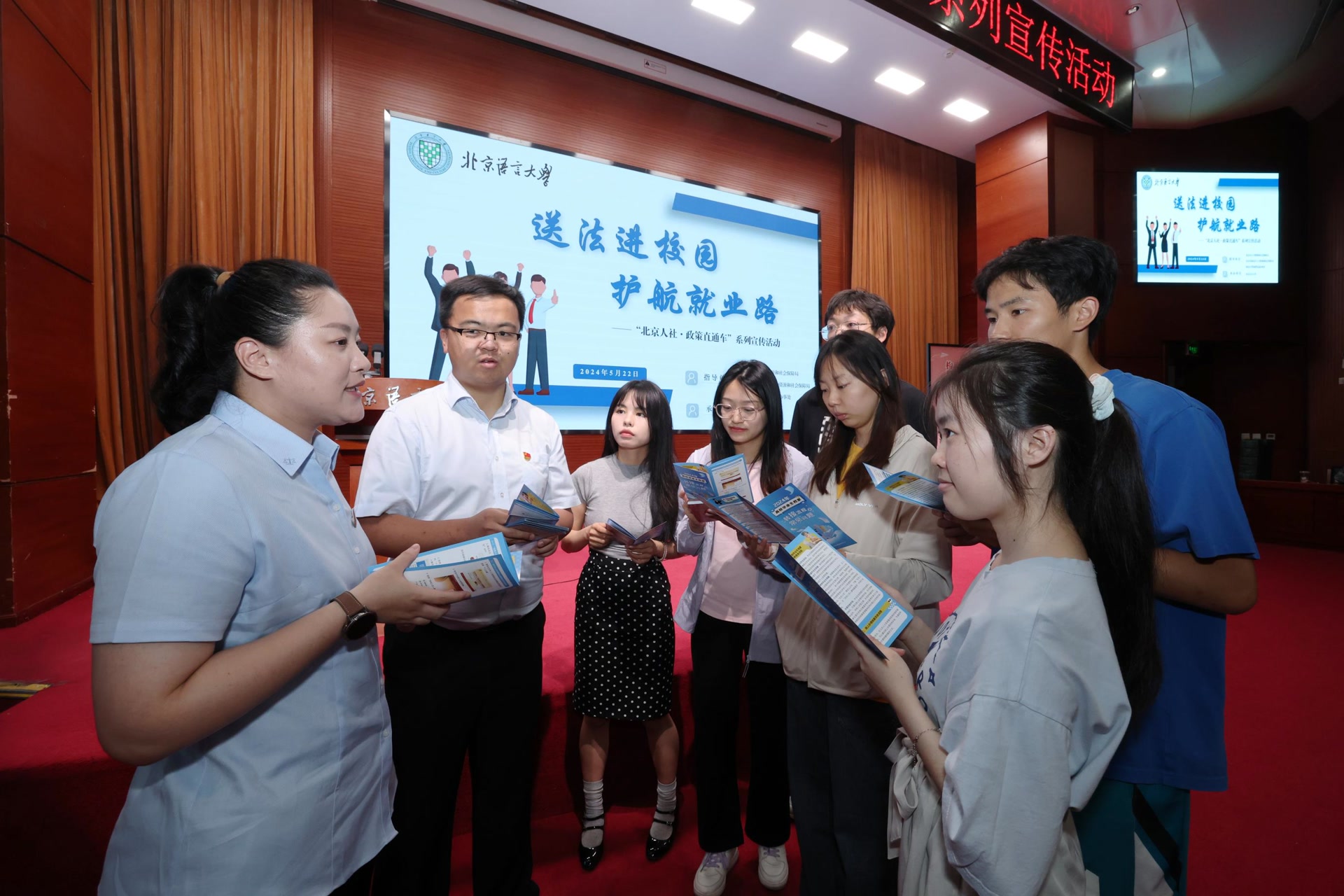 5月22日,北京市人社局、海淀区人社局联合学院路街道走进北京语言大学,举办2024年“北京人社·政策直通车”系列宣传活动之“送法进校园,护航就业路”,以“政策直通车 服务面对面”为主题,为近150名高校学生开展就业政策和仲裁案例法规宣讲,进一步提高人社政策知晓度,增强大学生们的劳动法律法规意识,助力高校毕业生实现高质量充分就业。