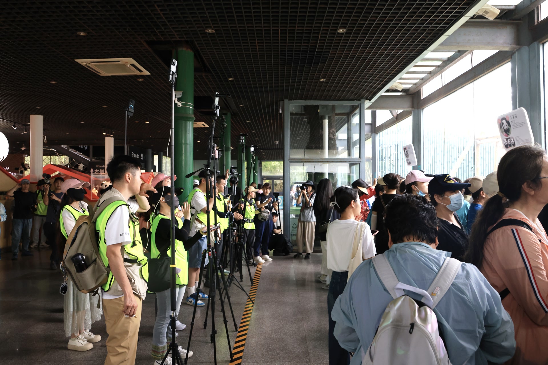 昨天上午10点,记者在奥运熊猫馆看到,一大群游客正挤在萌宝、萌玉的展馆前参观。距展厅玻璃四五米外的地上画有一道黄线,十多个身穿“直播”背心的人在线外一字排开,架起高过头顶的直播杆,对大熊猫进行拍摄直播。
