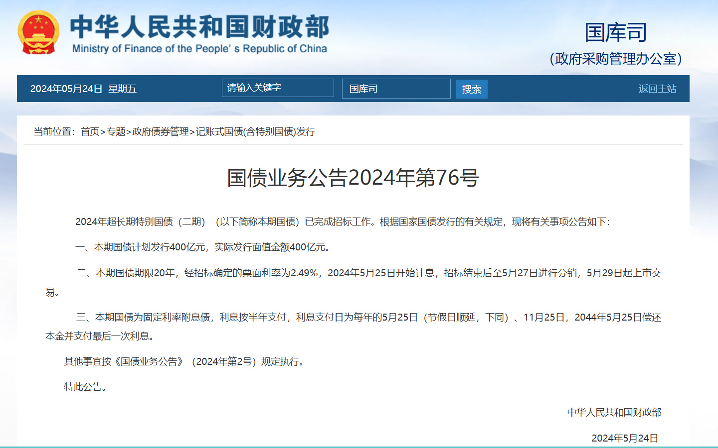 根据安排,此次发行20年期超长期特别国债为固定利率附息债,通过财政部北京证券交易所政府债券发行系统进行招标发行。债券票面利率于发行当日上午通过承销团竞争性招标后确定为2.49%。