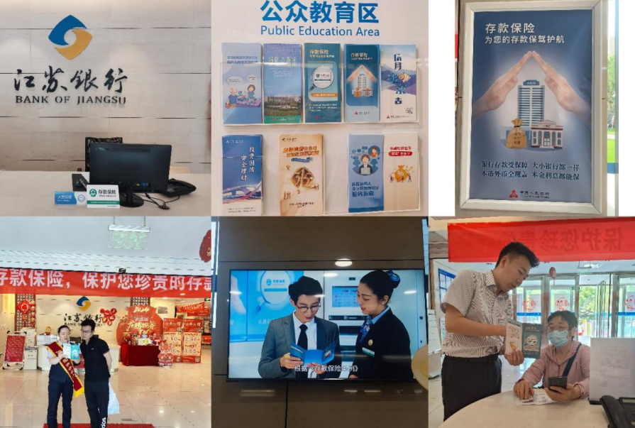 江苏银行北京分行辖内22家营业网点均在厅堂入口、大堂引导台、现金柜台、自助存取款机、智能柜员机张贴或摆放存款保险标识,在电视屏投放人民银行新版存款保险宣传视频,保证客户在办理业务各环节都能触及存款保险知识。各网点在厅堂显眼位置悬挂“存款保险,保护您珍贵的存款”、“施行《存款保险条例》,充分保障存款人权益”、“建立存款保险制度,促进银行业健康稳定发展”等标语横幅,在折页架摆放足量宣传折页供客户取阅,营造主题鲜明的宣传氛围。同时,各营业网点均安排专业人员在厅堂为客户答疑解惑,为有兴趣的客户“一对一”深入讲解相关知识,精细化推动“存款保险深入人心”。