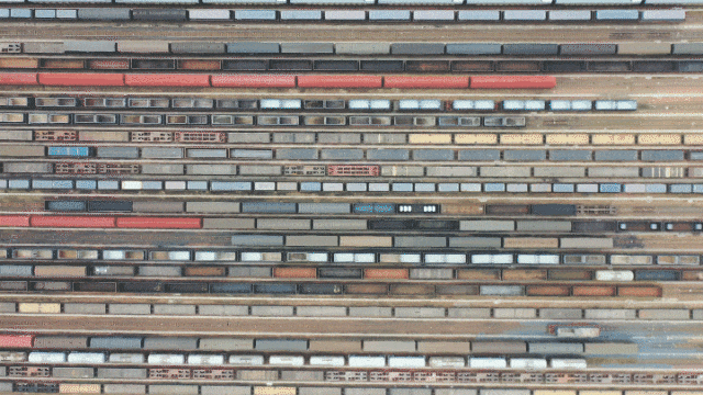 在这个有700多个足球场大小的编组站里,上百辆不同种类的货车整齐排列在股道中。从高空俯视,犹如一个庞大的“货车超市”。