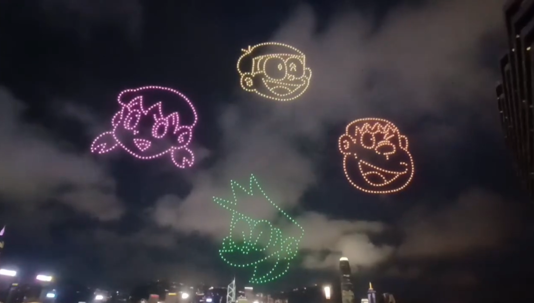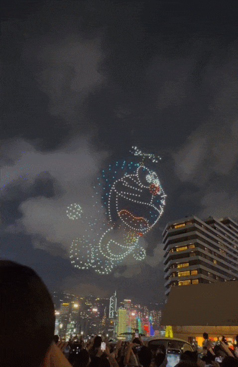 大家熟悉的哆啦A梦、大雄、胖虎等卡通形象,头戴“竹蜻蜓”,在维港上空飞翔。