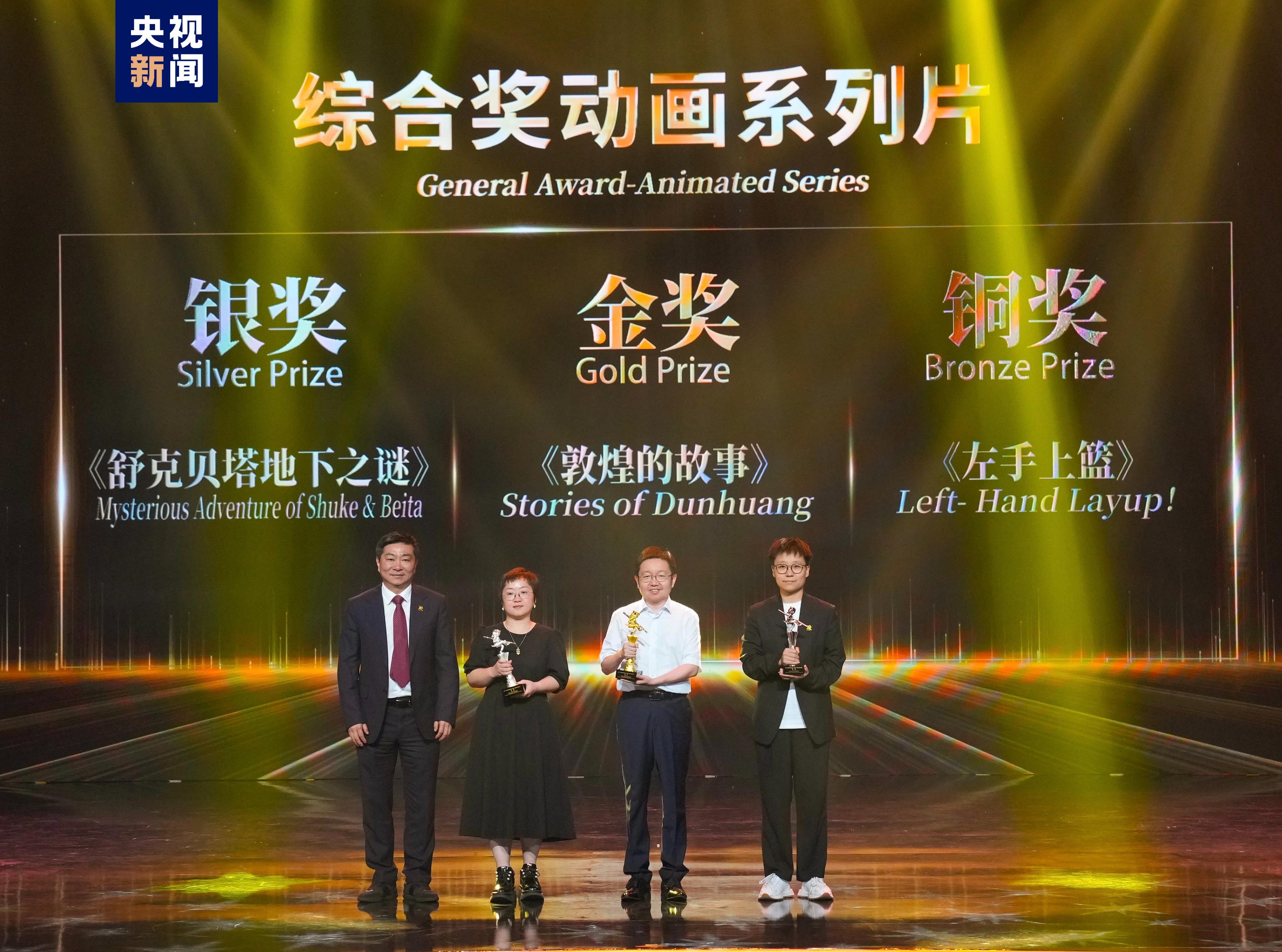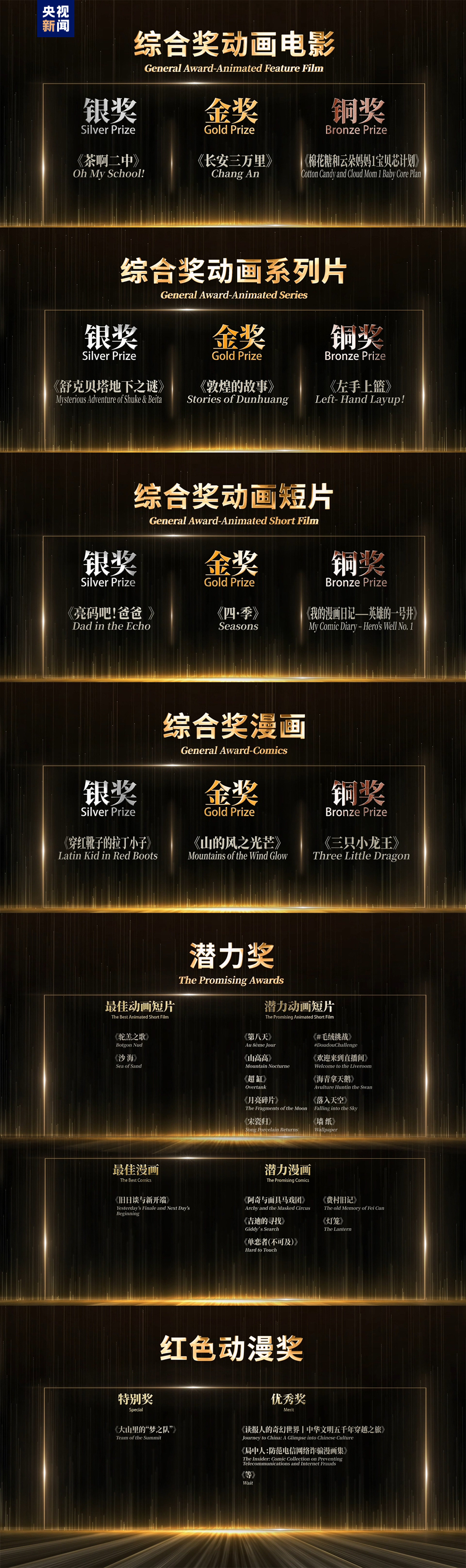 上海追光影业有限公司选送的《长安三万里》、北京光线影业有限公司选送的《茶啊二中》、总台央视动漫集团有限公司选送的《棉花糖和云朵妈妈1宝贝芯计划》分别荣获综合奖动画电影金、银、铜奖;总台央视动漫集团有限公司选送的《敦煌的故事》荣获综合奖动画系列片金奖;云栖博悟(杭州)文化传播有限公司选送的《大山里的“梦之队”》荣获红色动漫特别奖。