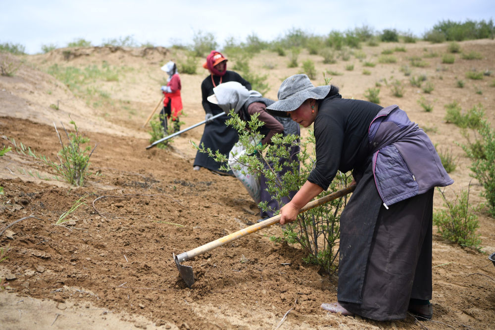 牧民在甘肃省甘南藏族自治州玛曲县欧拉镇黄河沿岸一处沙化草原治理点补种草籽(2023年7月6日摄)。新华社记者 方欣 摄