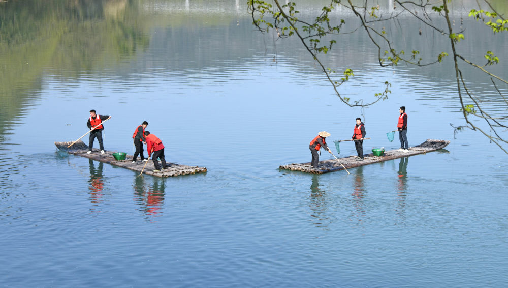浙江省台州市仙居县步路乡党员志愿者与河长一起在永安溪巡河护水,清理杂物垃圾(2024年3月20日摄)。新华社发(王华斌摄)