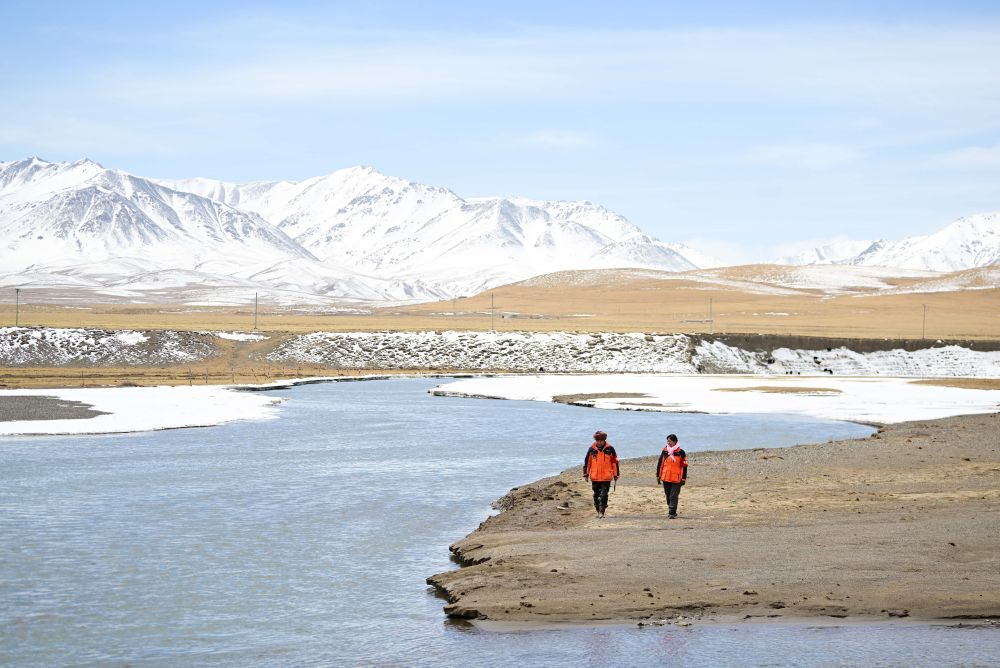 生态管护员叶金俄日(左)与东木措夫妇在青海省海北藏族自治州祁连县的黑河流域巡护(2024年3月21日摄)。新华社记者 张龙 摄