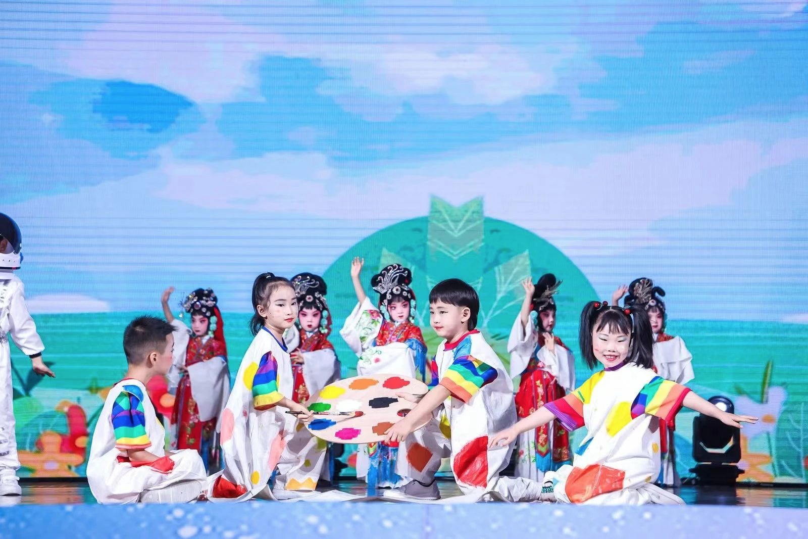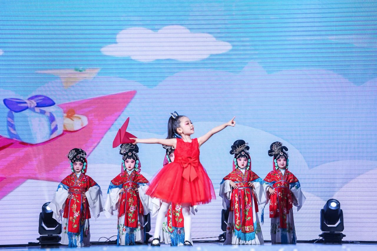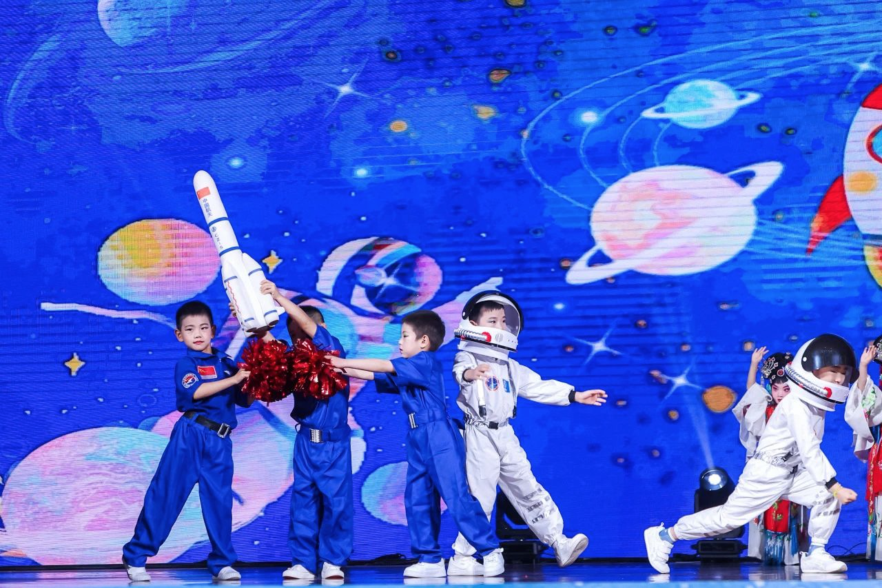京源学校幼儿部原创情景幼儿舞蹈《庆祝》用欢快的舞步,生动可爱的演绎出小宇航员、京剧花旦、小画家等童年理想,拉开“六一”展演的序幕。
