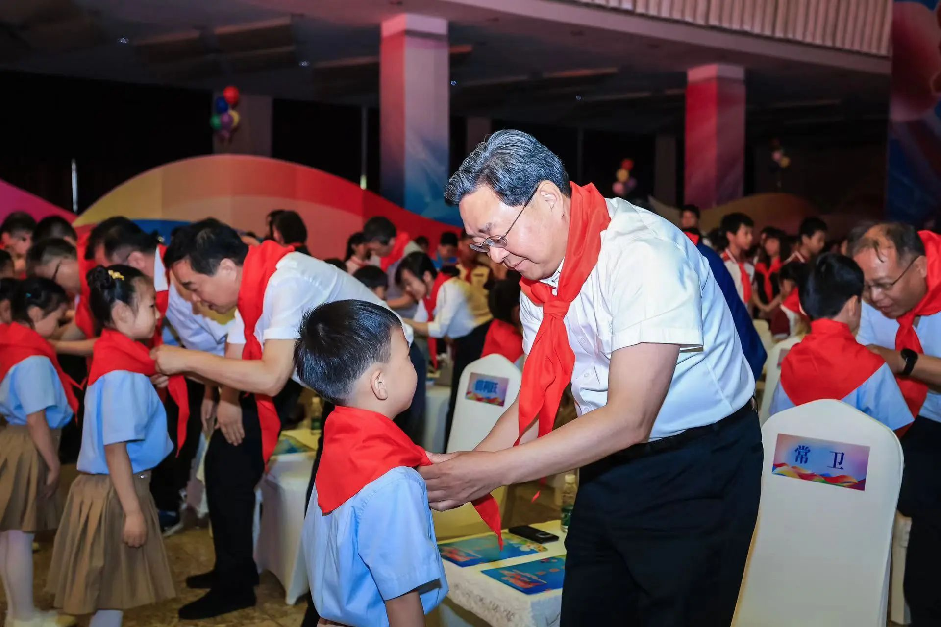与会领导、来宾和高年级少先队员为新队员授红领巾。少先队员们在联合大队长宫悦州的带领下进行入队宣誓。