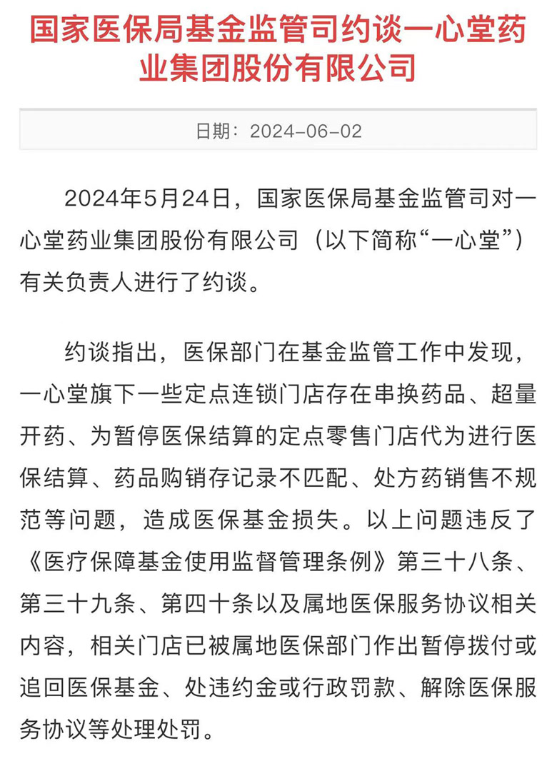 在基金监管工作中,国家医保局基金监管司发现一心堂存在上述问题,并于2024年5月24日对一心堂有关负责人进行了约谈。针对开展约谈的原因,国家医保局方面表示,近些年,国家建立完善医保谈判药品“双通道”管理机制、将定点零售药店纳入门诊统筹、加快推进跨省异地就医直接结算等,越来越多的参保人可以在家门口的零售药店刷医保码(社保卡)购药,群众的获得感、幸福感和安全感进一步提升。