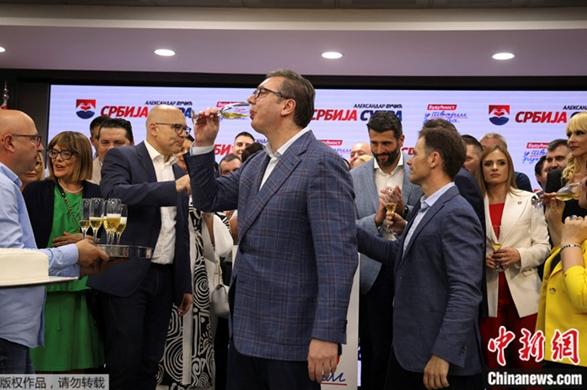 报道称,地方选举出口民调结果出炉后,武契奇在塞尔维亚前进党总部举杯庆祝这一胜利。