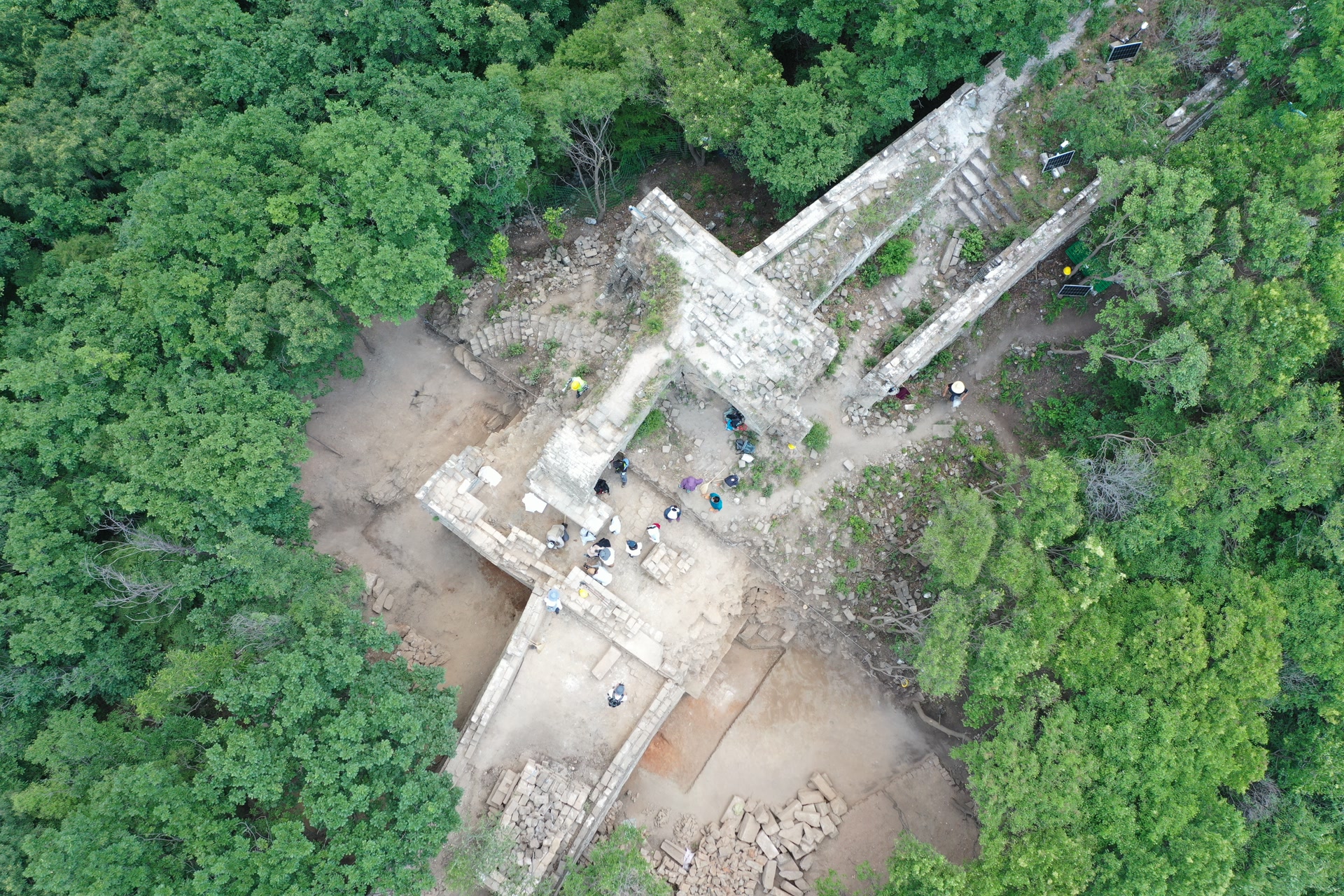 距离箭扣五期考古发掘启动时隔一个多月,这里已经规整了很多。敌台南北两侧外部堆积的碎砖石堆已经被清理干净,露出了长城本来的样子。120号敌台内部西北角的两处堆积最受关注。当尹达轻轻掀开遮盖时,略带黑灰色的土壤露了出来。这便是当天要采集的敌台活动面上的原始堆积土样,若隐若现的黑色便是藏于土中的炭化物。