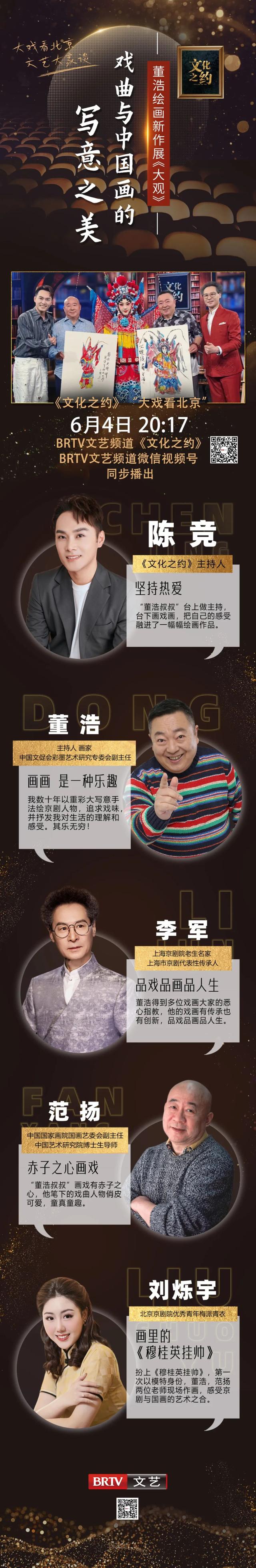 “董浩叔叔”认真做主持,画戏画专业不玩票。主持人、画家董浩,上海京剧院老生名家李军,中国国家画院国画艺委会副主任、画家范扬,北京京剧院梅派青衣刘烁宇做客BRTV文艺频道《文化之约》,现场京剧表演,更有挥毫泼墨,一场戏曲与绘画的文化之约!
