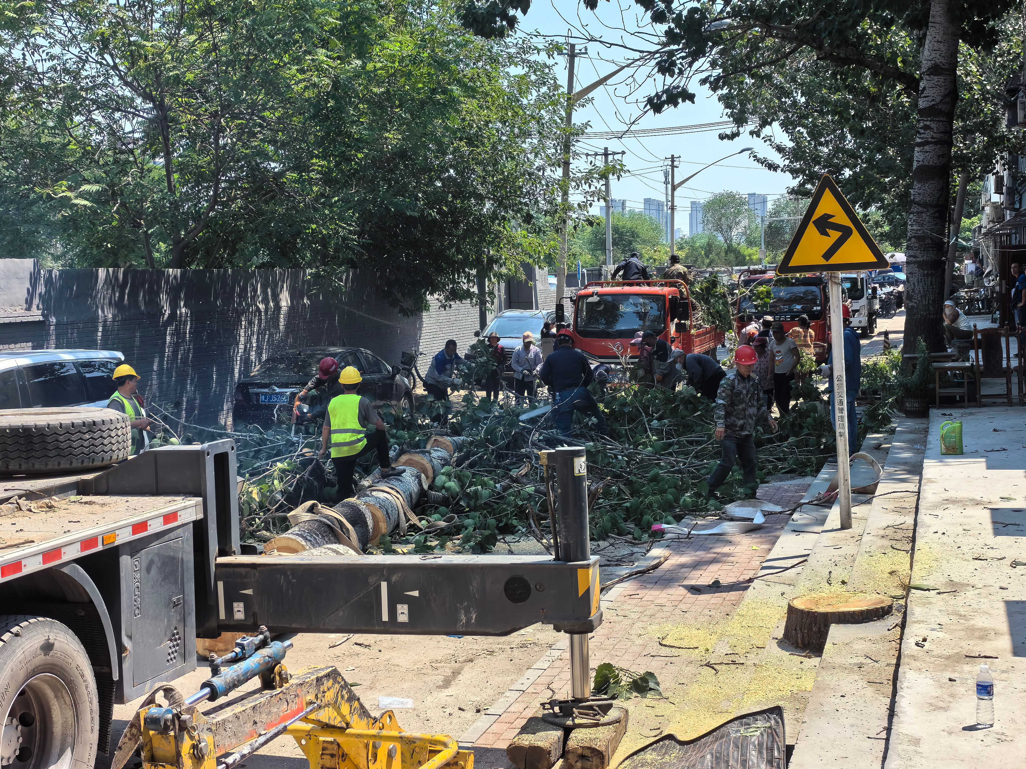 在双方的密切配合下,纪家庙村的伐树工作队进驻现场开始作业。为确保安全,万柳西园社区工作人员在周围拉起警戒线,维持交通秩序,提醒过往行人注意安全。经过一上午的努力,10棵枯死树木全部砍伐完毕,困扰居民多日的揪心事被彻底解决。“这下视野开阔了,居住环境也焕然一新。”随着一棵棵枯树被装车清运,居民们悬着的心终于放了下来,连声称赞社区和村的高效服务。