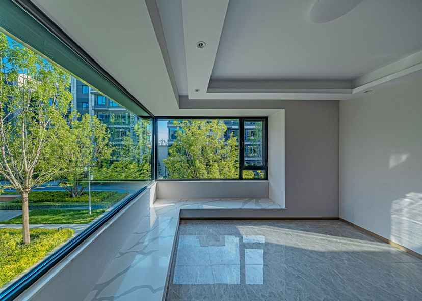 值得一提的是大面积外窗四周均设置金属窗套,采用铝合金型材及纤细的金属框线,极窄金属型材包边,质与美相得益彰。项目部分户型采用了常见于豪宅的270度无柱转角观景窗的设计,交付细节上,东西侧开窗采用外置隐藏式遮阳百叶,遮阳板作为建筑立面的基本构图元素,强调了建筑的连续性,也兼顾了遮阳措施的展示性和功能性。