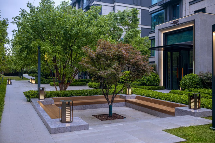 为了达到交付即呈现成品园林的效果,项目采用成年大树全冠移植,遴选晚樱、绚丽海棠、丛生元宝枫等二十余种珍稀花木,实现层层推窗见绿的园林景观。初夏时节,让业主在交付时即可感受到园区 “归家即度假、出门即风景”的静雅之美。此外,为了满足社区全年龄段业主的活动需求,项目设计了分龄主题的儿童区、串联全园的约700米环形活力跑道、为老年人打造的健身设施,还有为业主爱宠专门设计的宠物乐园,让每一位社区居住者都能享受其中。