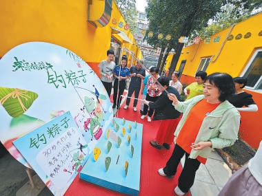 八角街道综合行政执法队队员来到康乐伴养老服务中心,同居民一起包粽子,进行钓粽子游戏共迎佳节。 本报记者 吴镝 摄