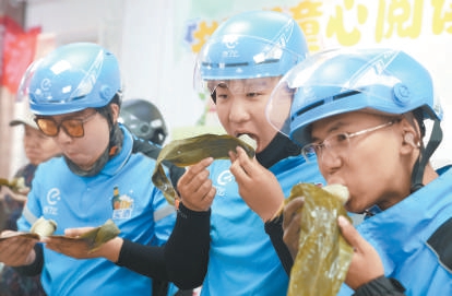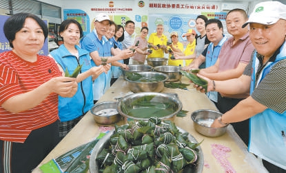安贞街道史超齐劳模工作室的志愿者们包了1000多个粽子分送到辖区内外卖员等异乡打工人的手中。 本报记者 程功 摄